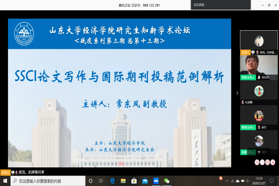 3月27日下午,beat365英国官网网站第13期研究生知新学术论坛(战疫系列第3期)以线上会议形式举行。beat365英国官网网站金融系主任常东风副教授为学院师生带来了题为“SSCI论文写作与国际期刊投稿范例解析”的报告。论坛由beat365英国官网网站副院长石绍宾主持。