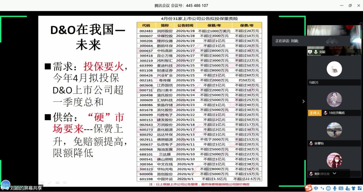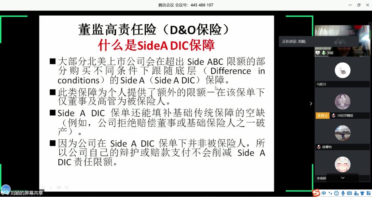 报告中,刘颖首先介绍了瑞幸咖啡事件背景、董高监责任险的概念及其在我国的发展情况,进而分析了瑞幸董高监责任险的理赔要点。报告伊始,刘颖从实际情况入手,为大家简单介绍了瑞幸咖啡财务造假事件的背景。随后她概述了董高监责任险的概念,该险种的赔偿责任构成以及承保范围等相关信息,加深了同学们对这一险种的认识。结合中国的国情,刘颖用图表详细解释了董高监责任险的承保范围,即SideABC保障。她提到,在传统的董高监责任险的承保范围中,SideA保障个人资产,即对董监事和管理人员进行责任保障;SideB主要转嫁公司风险,是公司补偿保障;而SideC的侧重点在于被告之间风险的重要分摊,是公司实体保障。与此同时,刘颖强调,SideA是唯一单独适用于董事及高管的保障。在讲解了传统意义上的董高监责任险后,刘颖又讲解了不同条件下跟随底层的超赔SideA保单,即SideA DIC。她从保障范围、针对保险人解散和推定赔偿风险的顺延责任条款和保护情况、针对董事及高管未稀释的专门限额、衍生索赔与证券集体诉讼的后来和解或判决四个方面将SideA与之进行对比,详尽地说明了SideA DLC的优势。随后,刘颖简单介绍了董高监责任险在我国现阶段的发展状况,用数据展示承保与理赔的情况,并对其未来发展趋势进行预测。结合2020年4月份有31家上市公司公告拟投保董责险的数据,她指出,董高监责任险的未来发展特点是供给趋紧,需求高涨。报告最后,刘颖将视角转回瑞幸事件,针对瑞幸财务造假在起保时间、可能索赔的情形、保单赔付等方面提出十二个问题,并对瑞幸理赔要点表达了自己的见解。