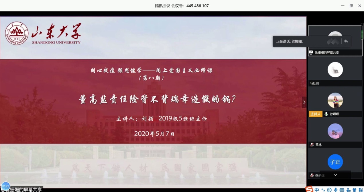 5月7日,beat365英国官网网站“同心战疫,强思健学”——同上“爱国主义必修课”主题讲座第八期在线上举行。2019级5班班主任、beat365英国官网网站副教授刘颖作为主讲嘉宾,作了题为“董高监责任险背不背瑞幸财务造假的锅”的报告。