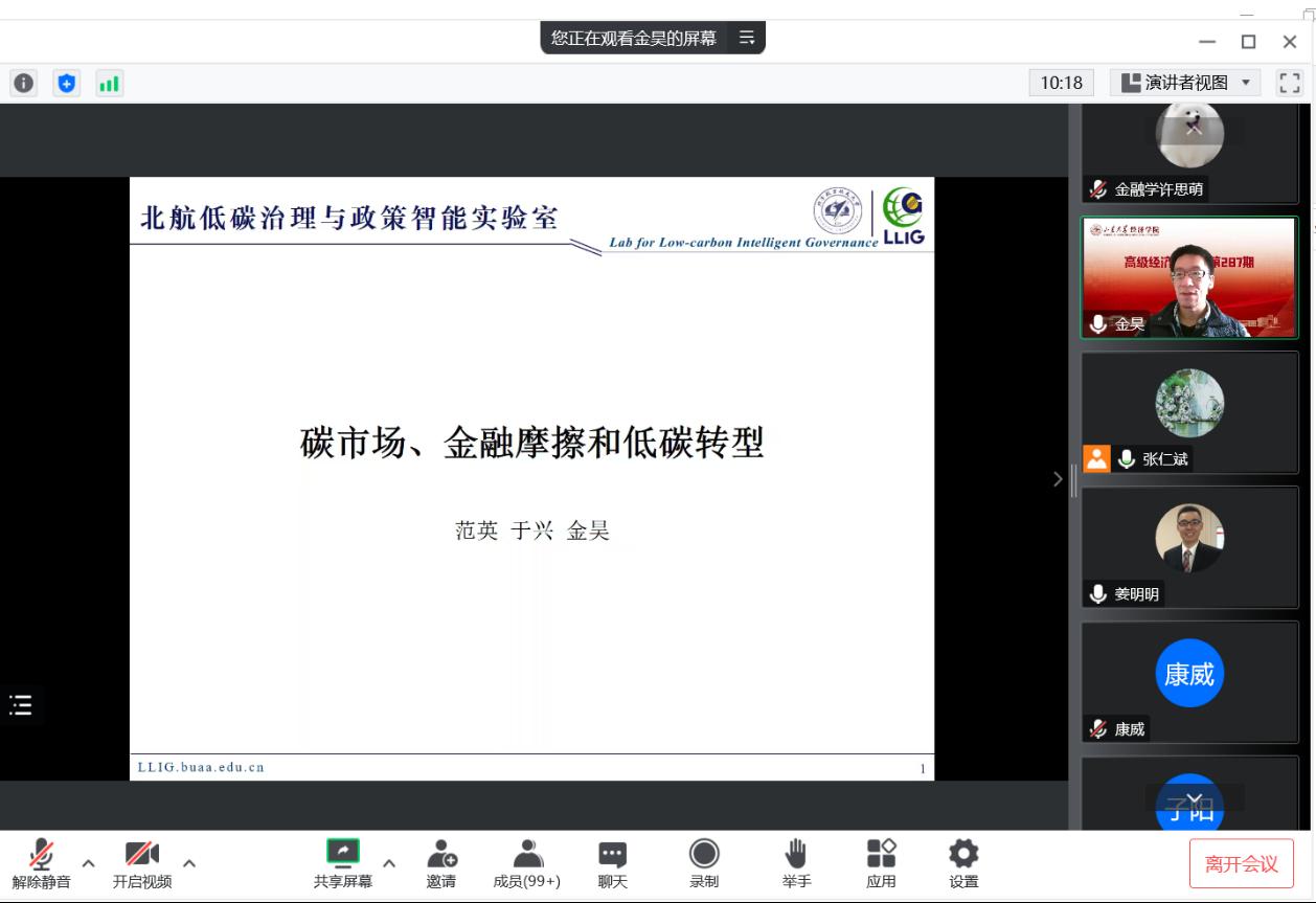 11月8日下午,beat365英国官网网站第287期高级经济学讲座以线上形式举行,北京航空航天大学经济管理学院金昊副教授作了题为“碳市场、金融摩擦和低碳转型”的学术报告,beat365英国官网网站副教授姜明明主持会议。
