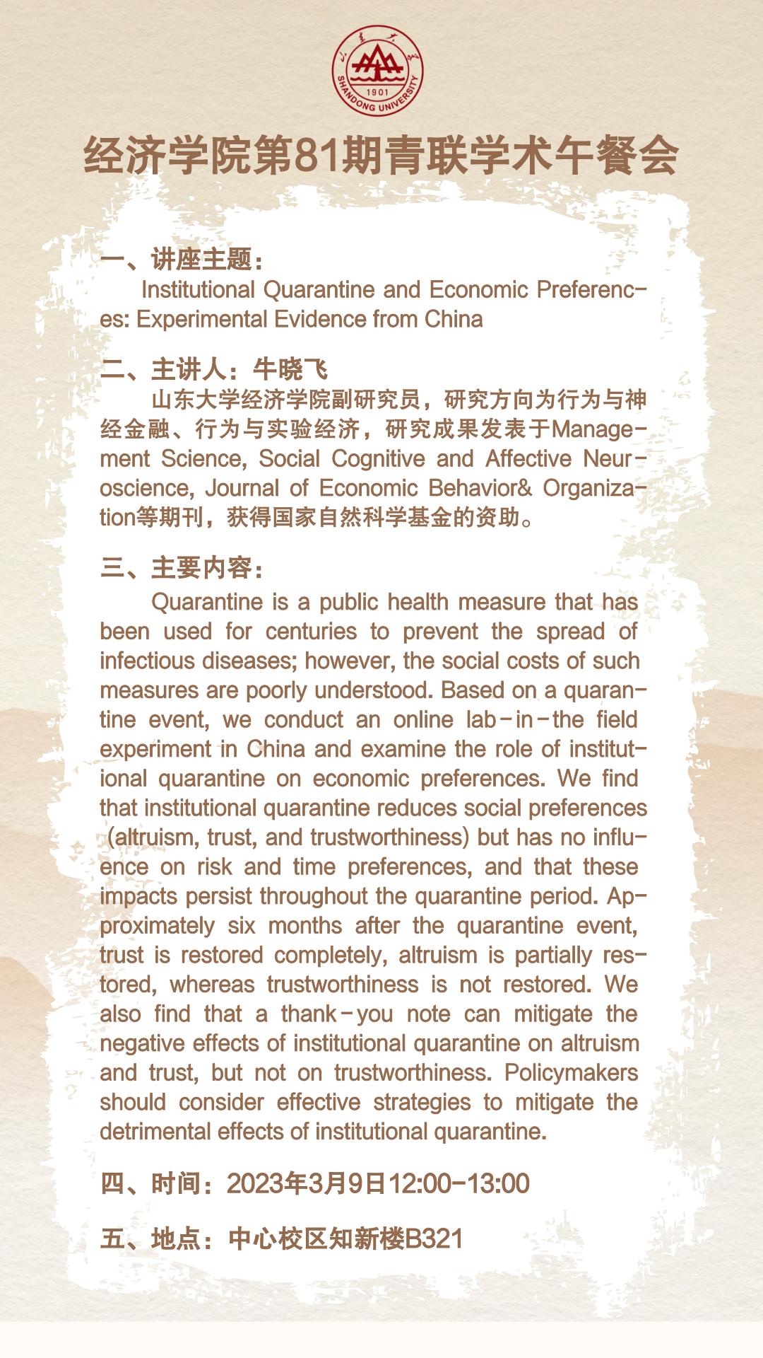 Institutional Quarantine and Economic Preferences: Experimental Evidence from China(beat365英国官网网站第81期青联学术午餐会)